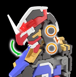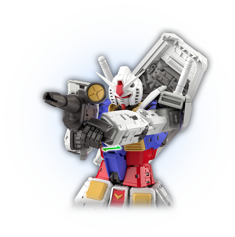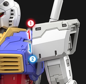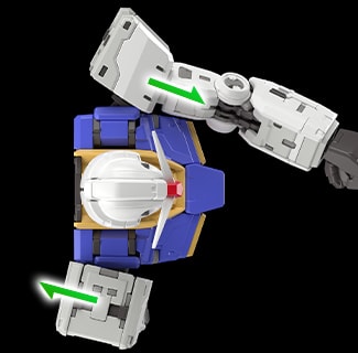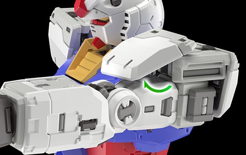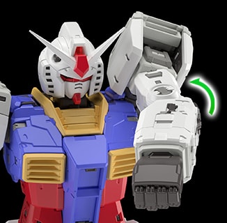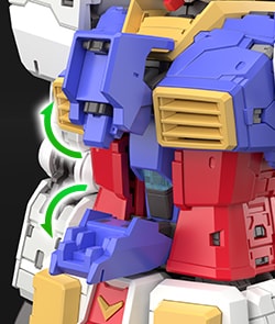 어깨 아머는 전방으로 열리는 구조를 채용했다. 팔을 앞으로 올렸을 때, 극 중에서 묘사된 것처럼 장갑이 앞을 향한 상태에서 팔을 뻗는 자세가 가능하다. 건담의 디자인을 살리는 가장 아름다운 자세를 즐길 수 있다.