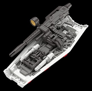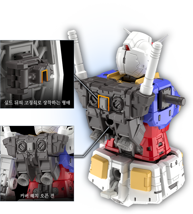 실드 뒷면에는 트러스 형태의 프레임을 조형했으며 이 프레임에는 빔 라이플이나 빔 사벨을 끼울 수 있다. 이때 쓰는 핀은 가동식으로, 사용하지 않을 때는 수납이 가능해 실드의 기능성과 디자인을 모두 살렸다.