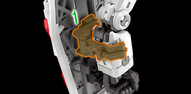 전신 내부 프레임은 설정을 바탕으로 한 세미모노코크 구조로 설계. 외장과 일체가 되어 기체의 강도를 자랑하는 구조로, 프레임과 내부 기기의 디테일 표현은 기존의 건프라와는 차원이 다른 밀도감을 보여 준다.