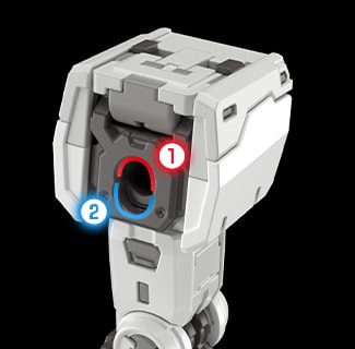 성형 색으로 구분해서 머리 부분을 설계. 트윈 아이 / 메인 카메라 / 매거진 드럼 / 뺨의 덕트 등 세세한 부분까지 디테일을 추가했다. 여러 색이 섞인 건담 머리 부분을 간단히 조립해서 이미지 그대로 완성할 수 있다.