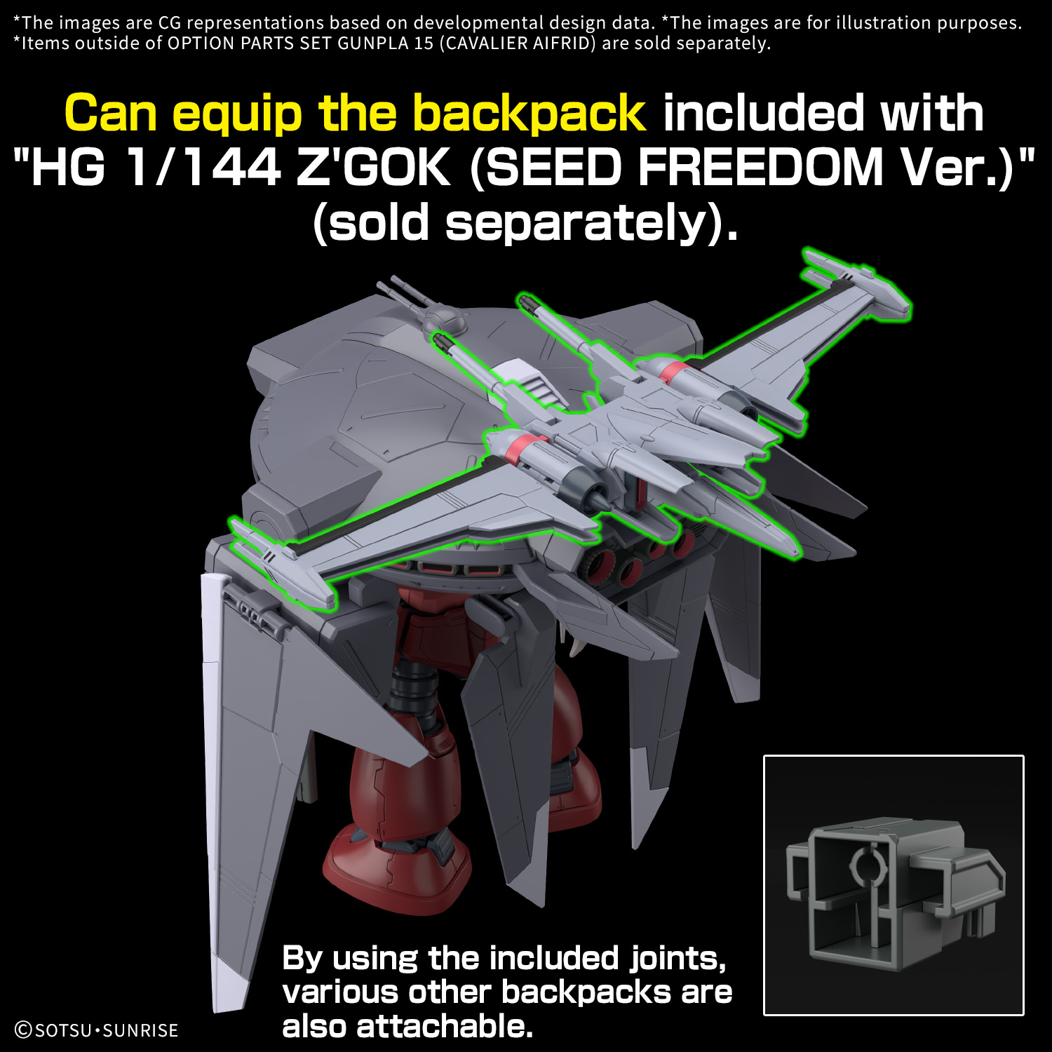 ■ 별도 판매인 「HG 즈고크(SEED FREEDOM Ver.)등의 다양한 백팩을 장비하는 것이 가능한 장착 조인트, 다른 키트에 레일 건을 장착할 수 있는 확장 조인트가 부속.